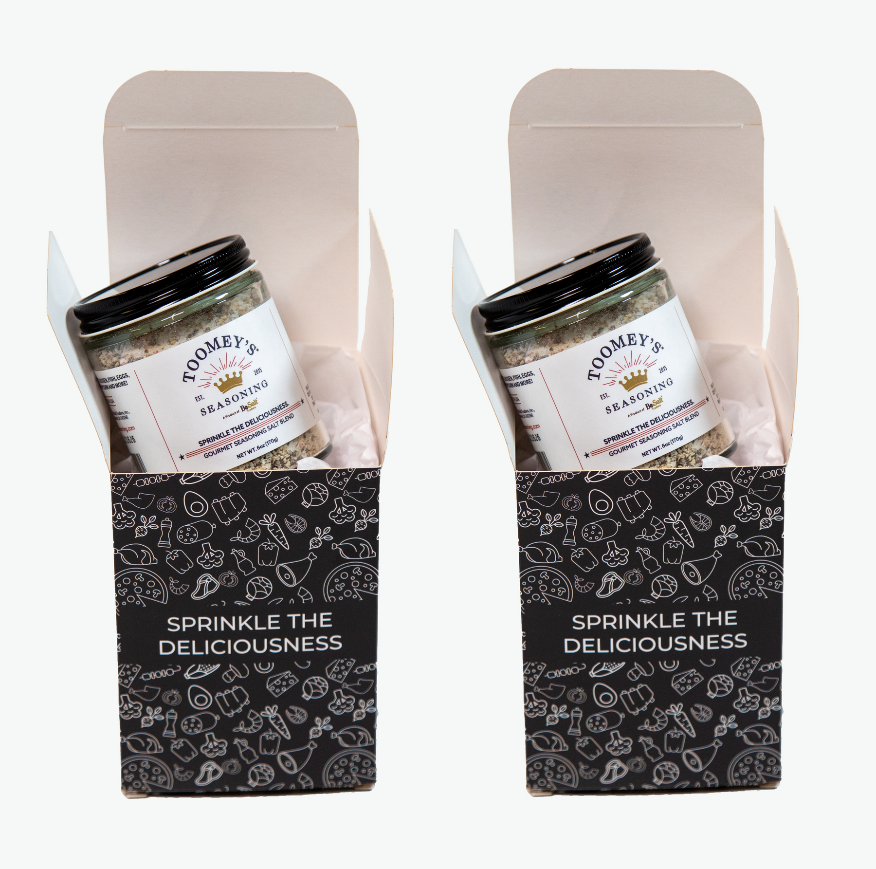 Sprinkle the Deliciousness with two Toomey’s Seasoning Gift Boxes & two 6-oz. Jars!